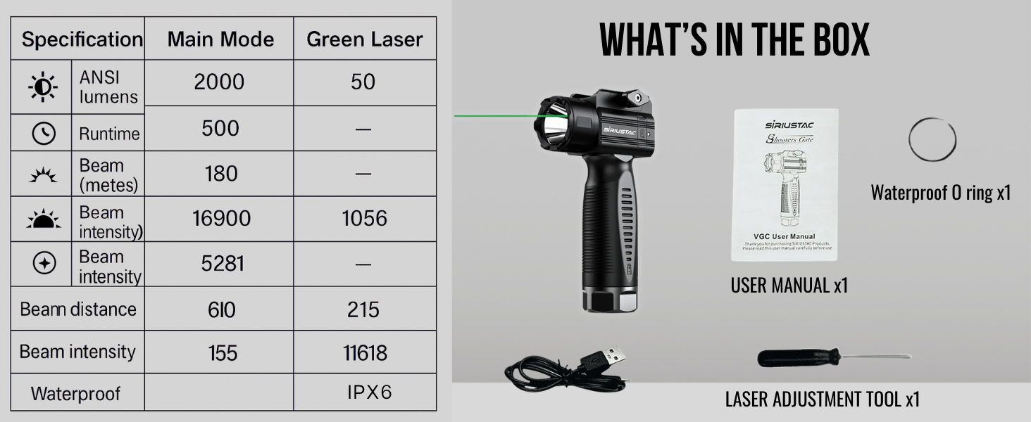 The build quality is solid and durable. The light is bright, and the green laser is clear even in daylight. USB-C charging is convenient, and the battery lasts long. The grip feels comfortable and fits well. Overall, a reliable and high-quality product.